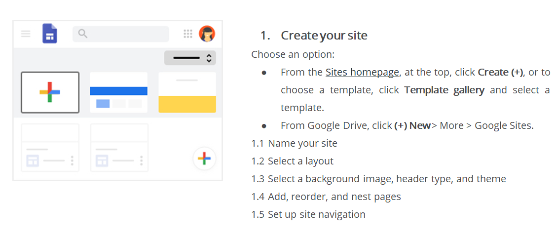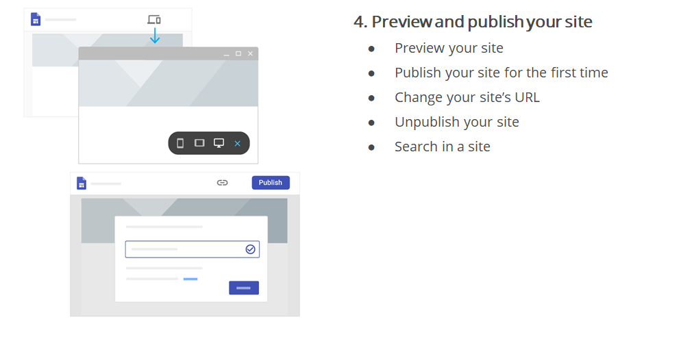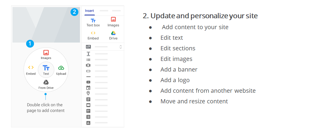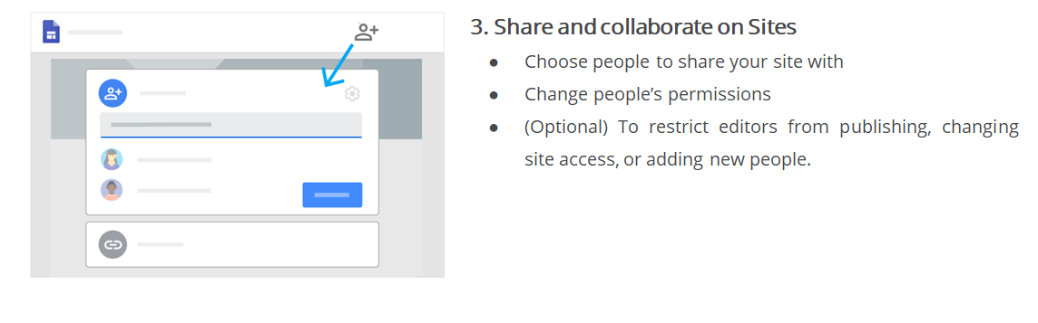Sites makes collaborating easy with real time co-editing and the same powerful sharing controls you're used to in Drive and Docs.