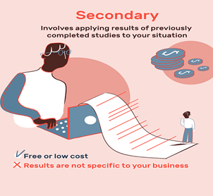 ប្រភេទការស្រាវជ្រាវដែលពេញនិយមបំផុតគឺការស្រាវជ្រាវបន្ទាប់បន្សំ។ វាត្រូវបានគេអនុញ្ញាតឱ្យប្រើជាសាធារណៈ និងឥតគិតថ្លៃ។ ការស្រាវជ្រាវបន្ទាប់បន្សំមានដូចជា៖ ព័ត៌មានពីគេហទំព័រ ទស្សនាវដ្តី និងការបោះពុម្ពផ្សាយពីរដ្ឋាភិបាល ទិន្នន័យជំរឿន និងជាលទ្ធផលដែលបានមកពីម៉ាស៊ីនស្វែងរកលើអ៊ីនធើណេត។