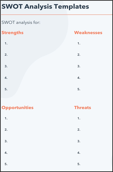 ភាពខ្សោយ ឱកាស និងកត្តាគំរាមកំហែងរបស់អ្នកនៅក្នុងទីផ្សារ។ ការវិភាគ SWOT បង្ហាញពីដោយផ្ទាល់នូវឱកាសដែលក្រុមហ៊ុនរបស់អ្នកអាចបន្តបង្កើតផ្តោតលើ និងធ្វើការដើម្បីយកឈ្នះគូប្រកួតប្រជែង។